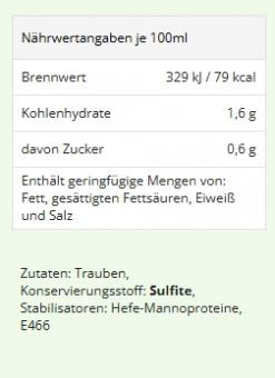 Ein Aroma nach tropischen Früchten, wie Mango und Pfirsich, auf der Zunge leicht nussig und würzig mit kräftigem Körper und angenehmen Schmelz im Abgang. (Alkoholgehalt 13,0% vol. , Zucker 5,3 g/l , Säure 5,4 g/l, enthält Sulfite)