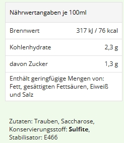 Alkoholgehalt 12,0 % vol. , Zucker 13,3 g/l , Säure 6,9 g/l, enthält Sulfite)