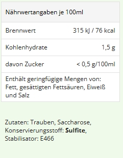 (Alkoholgehalt 12,5 vol.% , Zucker 5,1 g/l , Säure 6,1 g/l, enthält Sulfite)